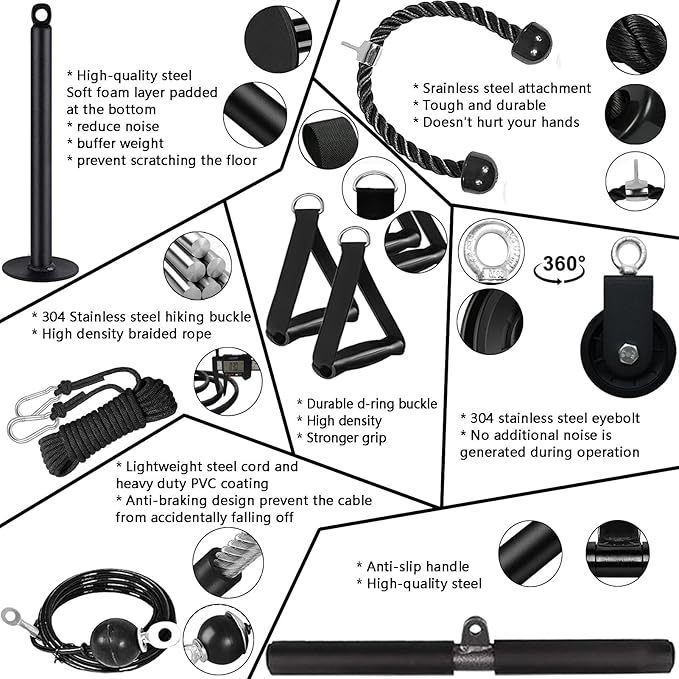 • 【 EASY TO USE 】Our Fitness Pulley Cable System Attachments can be installed anywhere you want,Installation and disassemble are very easy, Designed into simple installation and space saving workout equipment accessories machine. Its small package size allows you to take it with you and become your own personal gym equipment.and the disassembled accessorie,providing great versatility for your home gyms, training studios or various workout environments.