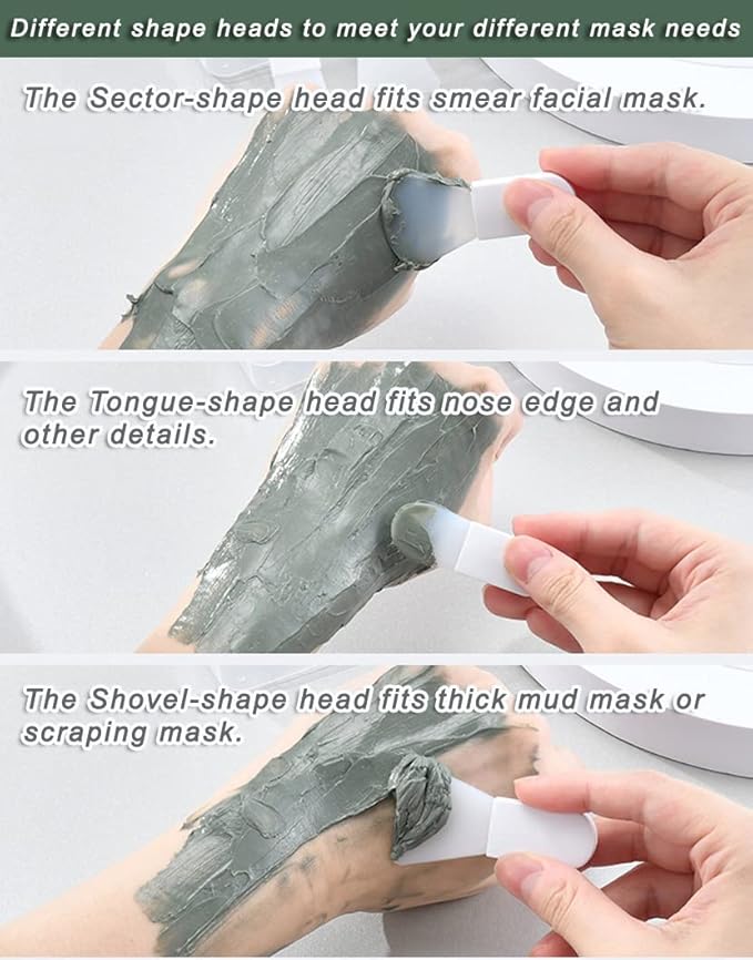• Silicone Brush Head: The brush head is made of soft silicone, safe and non-toxic, soft and not easy to break, and can be reused.easy to clean, quick drying. Different shape heads to meet your different mask needs; The sector-shape head fits Apply mask ,The small tongue-shape head fits nose edge and other details, The shovel-shape head fits thick mud mask or scraping mask.