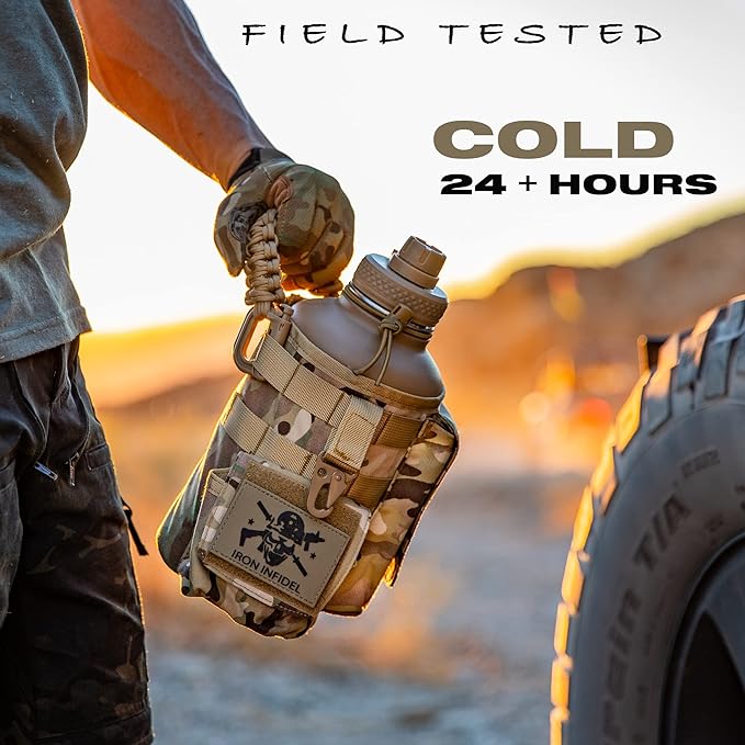 • PATENT PENDING DESIGN - This unique and original design is the only one of its kind. Iron Infidel created and patented this original design with our military, law enforcement, first responders , and hard working patriots in mind. These men and women put in long, hard days and a petite water bottle just won't cut it. Stay hydrated all throughout your hardest days, and you might as well do it with a bottle that looks cool. Grab the 21st century replacement of your old military canteen.