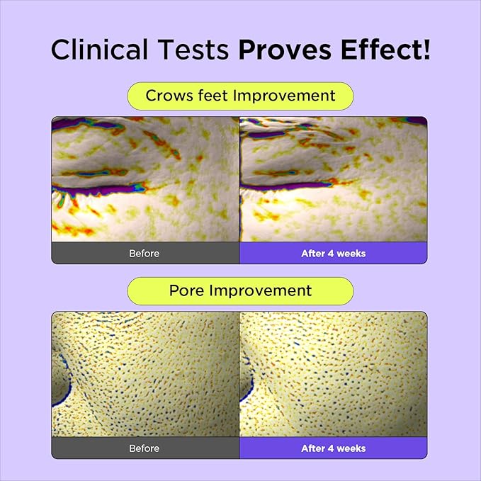 • πŸ“Š NOTICEABLE RESULTS: βœ…Immediate effect on quantity, size, volume, and depth of the skin pore with one-time use βœ… Improvement on skin moisturizing, eye wrinkle, skin elasticity, face lift (cheek), skin density and skin texture (roughness) with 4 weeks use πŸ’›FLUORESCENT YELLOW COLOR IS THE NATURAL COLOR OF RETINAL πŸ’›