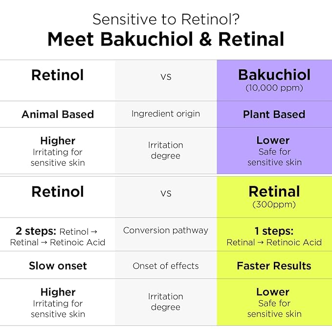 • πŸŒ™NEXT-GEN RETINOL: Formulated with two next-gen retinol alternatives, Bakuchiol (1%) and Retinal (0.03%). Retinal is the perfect alternative to the irritation of Retinol with a higher activity level. Bakuchiol is a plant-based retinol alternative with fewer side effects and is safer to be used for all skin types, making it easy for beginners. Formulated alongside with Hyaluronic Acid and ceramide, it works during your sleep so you can wake up to a visibly smoother, bouncier skin.