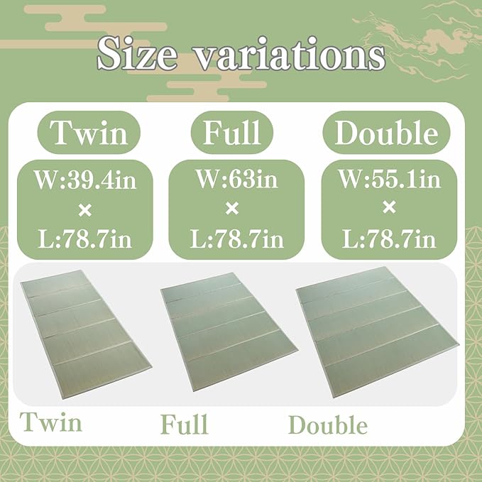 • ✅ Product Details - Size: 63" x 78.7",Structure,Outer fabric = mesh Igusa,Medium material = EPE 3/8",Bottom: 100% polyester (non-slip surface),Laundry label = Not washable.People-friendly natural materials.Tatami has long been loved by the Japanese people.The tatami mats have become modern mattresses.Tatami mat, Japanese rugs or any futon underlay are made with a rush plant, igusa.