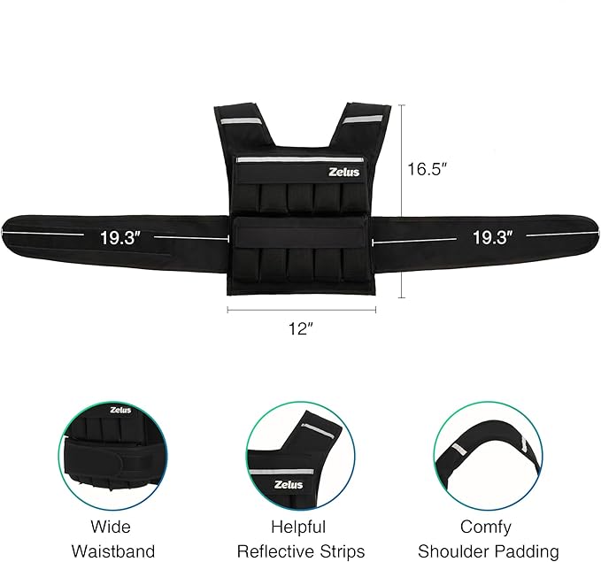 • ADJUSTABLE WEIGHT VEST: This one size fits most weighted vest by Zelus comes with adjustable weights, adding plenty of variable low impact resistance to help strengthen your core, grow endurance, and trim fat