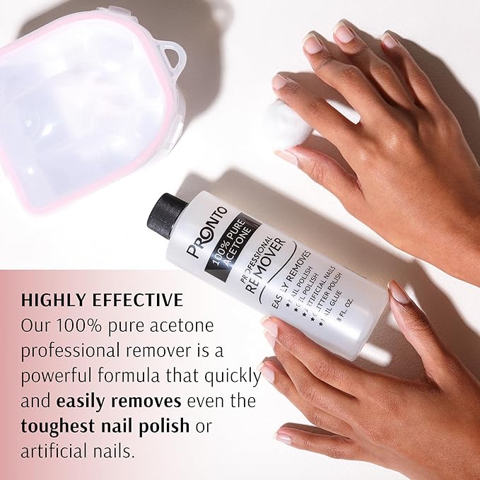 • THE ONLY ONE YOU NEED: Pronto Pure Acetone easily removes nail polish, gel or shellac polish, sculptured nail forms and nail art, artificial nails, glitter polish or nail glue. You can use our professional acrylic nail remover straight from our bottle or from an acetone dispenser.