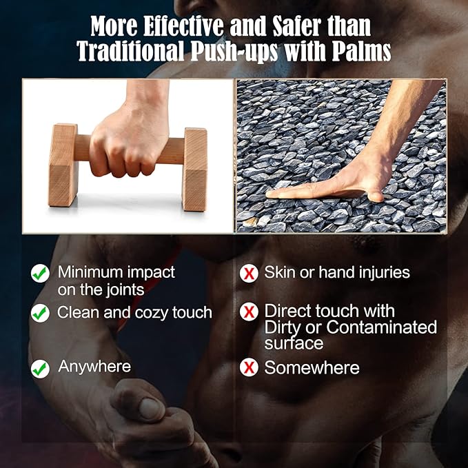 • Stable & Durable Design: Push up bars is crafted from premium solid beech wood; Non-slip rubber base enhances workout stability; Protects hardwood floors from scratches