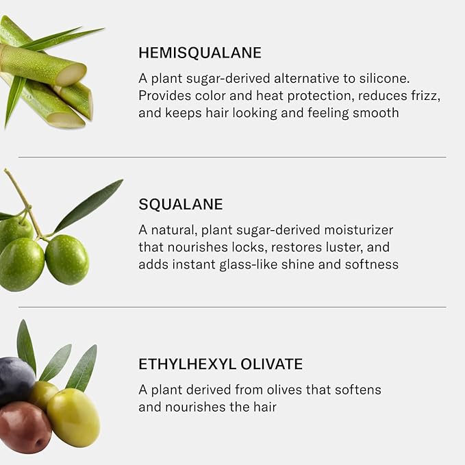 • Hero Ingredients: Hemisqualane – a plant sugar-derived alternative to silicone that reduces frizz and keeps hair looking and feeling smooth. Squalane: A natural, plant sugar-derived moisturizer that nourishes locks, restores luster, and adds instant glass-like shine and softness. Ethylhexyl Olivate: A plant derived from olives that softens and nourishes the hair