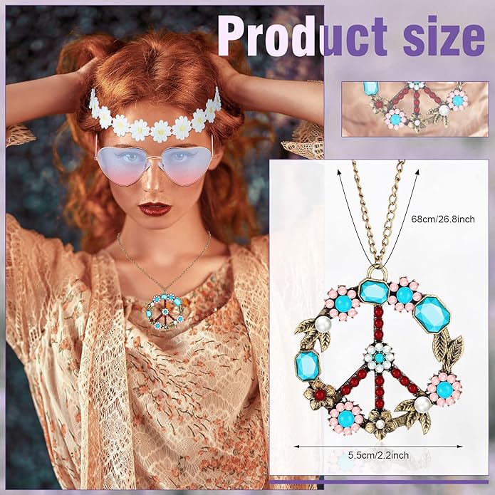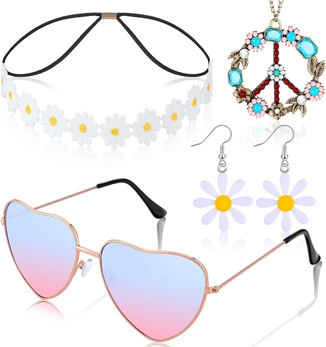 • Item type name : 4 Pieces Hippie Costume Accessories Set 70s Peace Sign 60s Outfits for Women Necklace Daisy Earrings Flower Headband Sunglasses for Girls Disco Party Jewelry Supplies