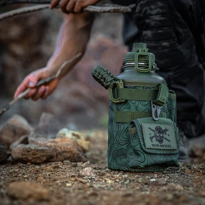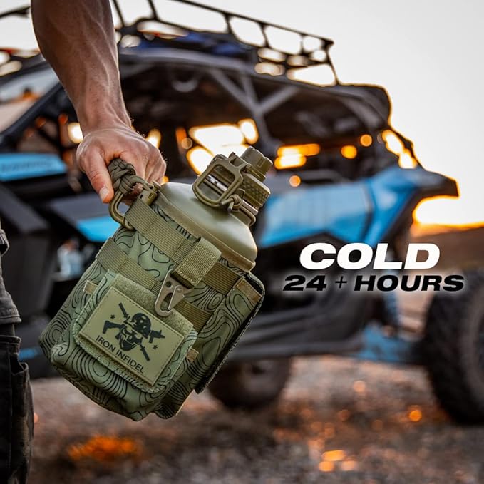 • PATENT PENDING DESIGN - This unique and original design is the only one of its kind. Iron Infidel created and patented this original design with our military, law enforcement, first responders , and hard working patriots in mind. These men and women put in long, hard days and a petite water bottle just won't cut it. Stay hydrated all throughout your hardest days, and you might as well do it with a bottle that looks cool. Grab the 21st century replacement of your old military canteen.
