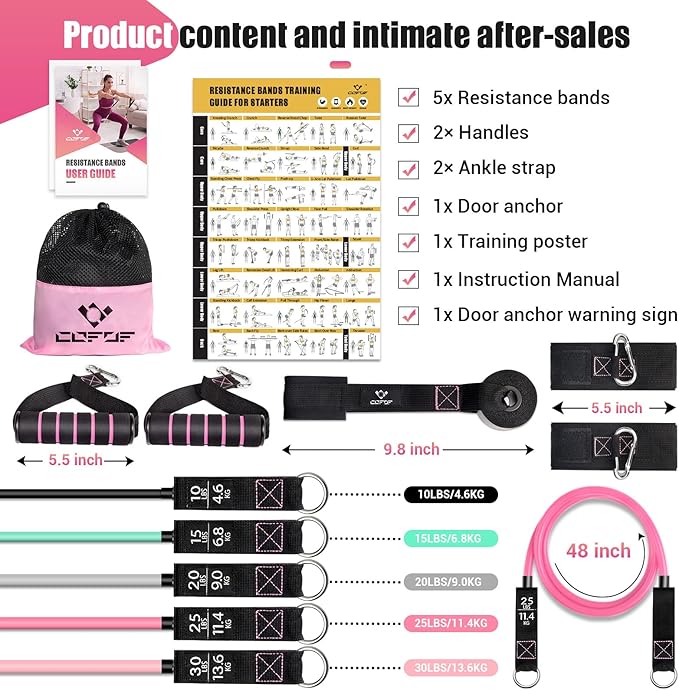 • 💞Upgraded Resistance Bands & After-sales Service: You will get resistance band*5, 2 handle, 2 ankle strap, 1 door anchor, 1 training poster, 1 instruction manual. To increase your workout intensity level, simply combine resistance bands with training posters to suit your workout needs. With resistance band exercises, you can get the perfect shape. If you encounter any problem while using the product, please contact us and we will help you to solve it within 12 hours.