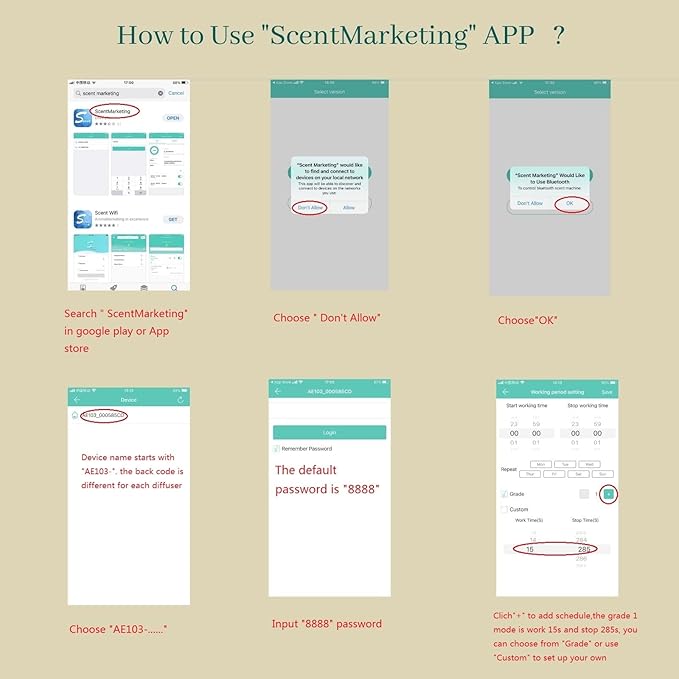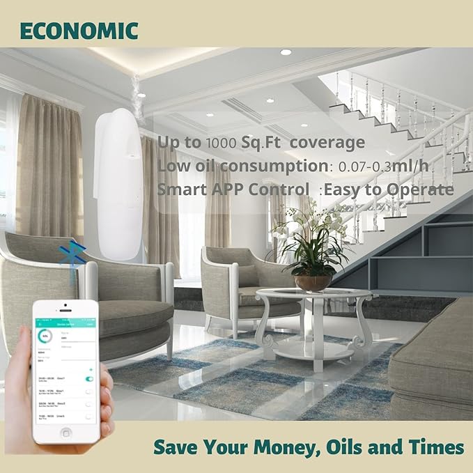 • 【Smart APP Control,So Easy】Our smart scent diffuser has two control modes :1. Bluetooth - the home diffuser comes with an App so that we can set how long and when to start diffusing. You can set a timer for how often and how much it sprays. 2. Convenient mode-directly pluged in, the product will work as Grade 1 for 24 hours. This can satisfy customers or the elderly who do not want to download an APP.