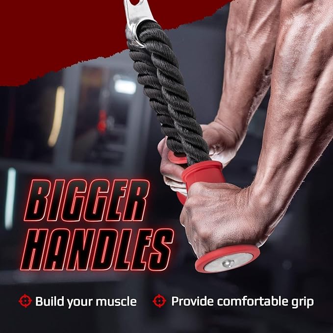 • BIGGER HANDLE & ERGONOMIC DESIGN: The gym rope pull down has big handles (1 13/16 inches in diameter) and an ergonomic design for wrist and full palm support; This helps target muscle groups (triceps, biceps, back, shoulders, abs) and strengthens hands