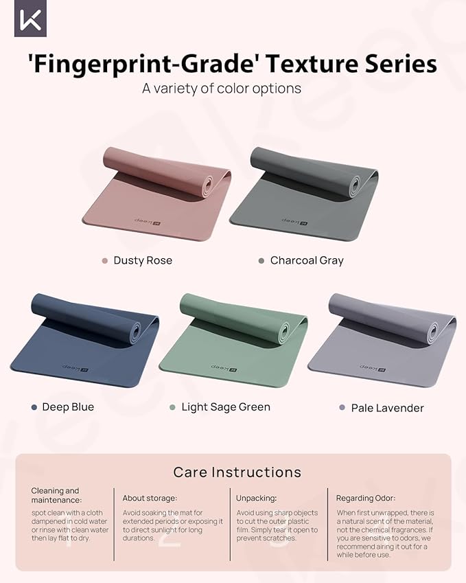 • Care Instructions -- Before first use, allow the yoga mat to air out to dissipate any odor that may have developed from being stored in the packaging. As for cleaning, spot clean with a cloth dampened in cold water or rinse with clean water then lay flat to dry. Avoid soaking the mat for extended periods or exposing it to direct sunlight for long durations