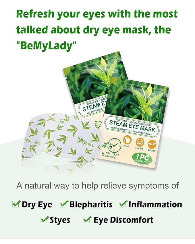 • πŸ˜‡γ€Green Tea Self Heated Eye Mask 】Our steam eye masks can relieve your eye fatigue,moisturize your eyes,improve your sleep quality,reduce dry puffy eyes and dark circles.This self warming heated eye mask will promote your blood circulation, release fine moist steam, comfort the skin around eyes, let tired eye enjoy the steam, fully relieve dry eyes and eye astringent with just 30-minute eye spa.