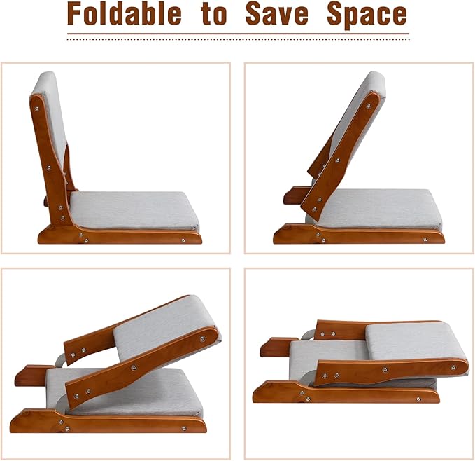 HollyHOME Floor Chair with Back Support, Foldable Japanese Style Floor Chair, Wood Legless Tatami Chair with Cushion, Accent Meditation Floor Seat for Bay Window, Living Room, Bedroom, Grey