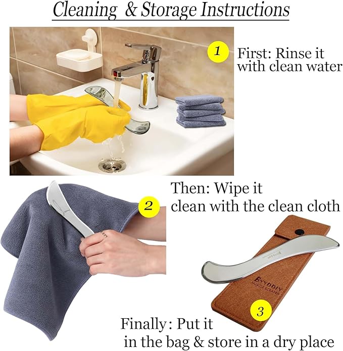 • ♕This scraping massage tool set with a black felt protective bag for easy storage and carrying.This Gua Sha Scraping Massage Tool are made of medical grade stainless steel. The edge is polished with mirror surface. It will not scratch the human body during use.