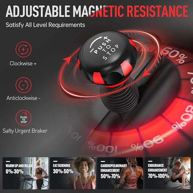 • 【Unique Updated Designs】① Unique 12.6” enlarged tablet bracket supports objects from mini to big (mobile, water bottle, books, tablets, laptops).② Unique resistance and urgent stop system: 5 stronger magnets for magnetic resistance + extra leather brake pad for safer emergency stops (no impact on normal cycling).