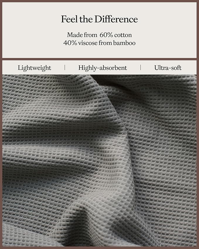 • ULTRA-SOFT YET ABSORBENT: Made from a premium blend of 60% cotton and 40% viscose from bamboo, this waffle weave towel set offers exceptional softness, lasting strength, and quick-drying performance for a touch of everyday luxury.