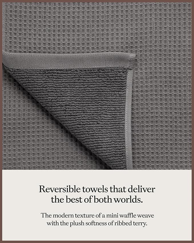 • MODERN TEXTURED DESIGN: Our waffle bath towels combine a mini waffle weave on one side with soft, ribbed terry on the other, bringing timeless style, plush texture, and superior drying power to your daily routine.