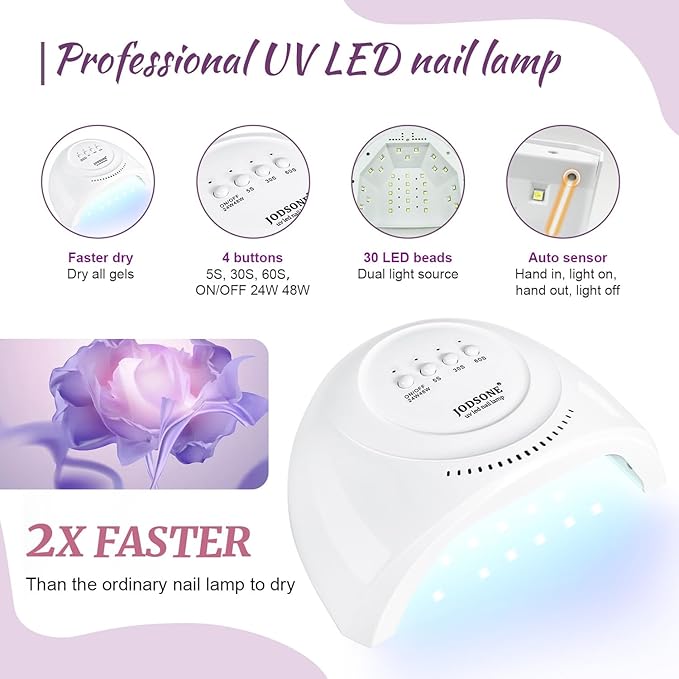 • Nail Lamp: This nail lamp has 3 curing modes, 5s, 30s, 60s, one minute to cure gel nail polish. And it contains 30 led small light beads and can cure each nail in all directions. Smart nail lamp, hand in, the light is on; hand out, the light is off.