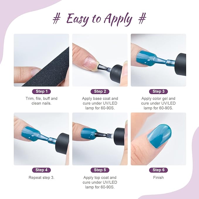 • Health Ingredients: Gel nail polish is made of natural resin, health substance and professional formula. The texture is silky, which can be easily smeared; The brush is soft and can be applied in all directions. It is very friendly to novices and professional manicurists. Please use them with confidence.