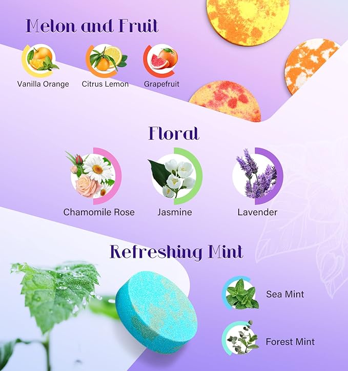• Pure Natural Aromas for Relaxation -- Discover the ultimate relaxation experience with our Variety Pack of 8 Scents Shower Steamers. Each steamer is infused with 100% natural and organic aromas sourced from fresh plants and fruits, including soothing Lavender, fragrant Jasmine, zesty Lemon & Mandarin, and more. This collection offers a delightful sensory journey, allowing you to indulge in the best of nature's scents. Perfect as self-care gifts for women, these shower steamers are highly regarded as unique and popular relaxing gifts.