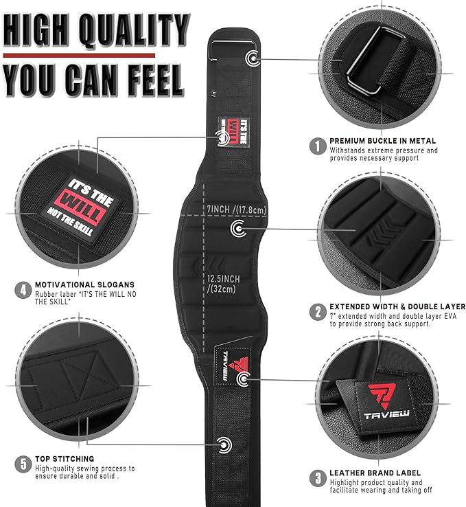 • ✅ COMFORTABLE LUMBAR & BACK SUPPORT: Protect your back with our premium 7” nylon weightlifting belt.Protect your back with our premium 6” nylon weightlifting belt. Our weight belt offers a reinforced back area with a full 4” wide Velcro strap for a perfect, secure fit. Our back belt offers great support and top stability to the lower back and abdominal. It is a must have for heavy squats, deadlifts, rows, and more!
