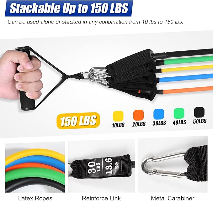 • 【12pcs in one set】: 5pcs different resistance bands[ Black (50lbs) > Green (40lbs) > Blue (30lbs) > Orange (20lbs) > Yellow (10lbs)], 2pcs anti-slip handles, 1pcs premium door anchor, 2pcs ankle straps,1pcs workout guide and 1pcs carry gift bag, you can have all in one set, easy to train, easy to carry for travelling.
