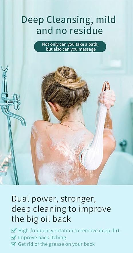• 【Ergonomically Lengthened Handle】This electric shower brush is designed with a 14.6inch extended handle to help you reach your lower back and other hard-to-reach places. The handle is designed with side anti-slip strips and grooves, making it easy to grip and non-slip. The ergonomic curved brush head makes it more comfortable and efficient to use. Hooks can be used to store bath brushes, saving space.