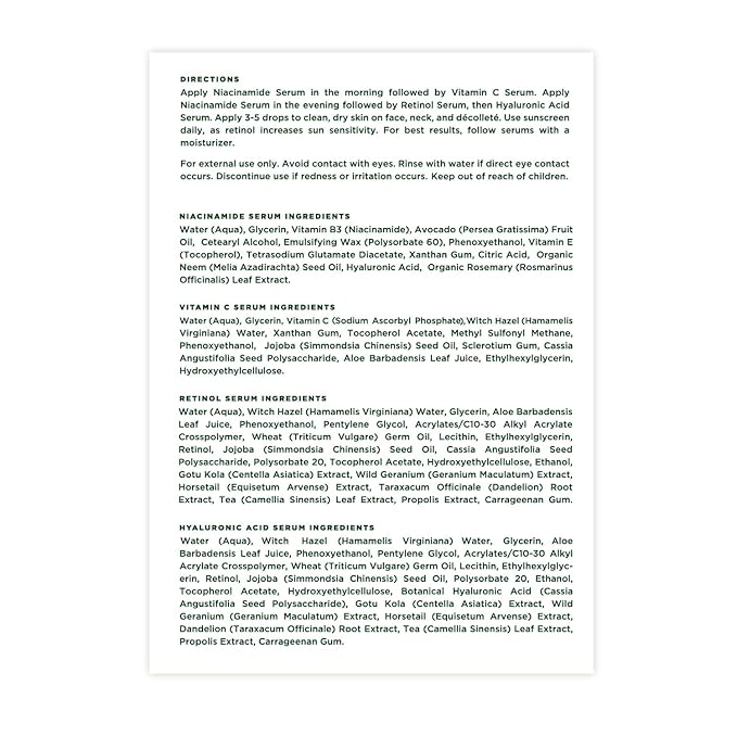 • EASY TO USE DIRECTIONS: Apply Niacinamide Serum in the morning followed by Vitamin C Serum. Apply Niacinamide Serum in the evening followed by Retinol Serum, then Hyaluronic Acid Serum. Apply 3-5 drops to clean, dry skin on face, neck, and décolleté. Use sunscreen daily, as retinol increases sun sensitivity. For best results, follow serums with a moisturizer