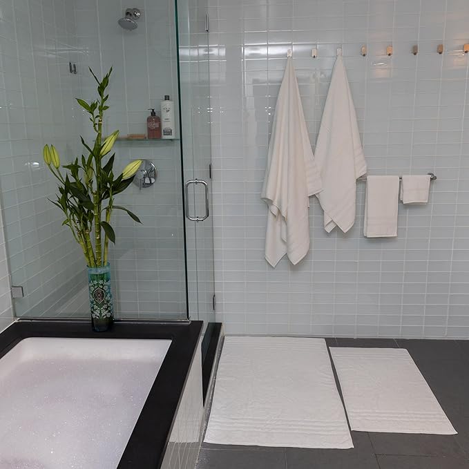 • Towels: 50% Viscose Made From Bamboo & 50% Aegean Turkish Combed Cotton, 700 GSM / Bath Mats: 55% Viscose Made From Bamboo & 45% Aegean Turkish Combed Cotton, 1000 GSM – Carefully crafted with optimal weight and thickness to soak up water and comfort your skin. Double twisted yarns are spun out of extra-long fibers to ensure superior quality and performance. Buy individually or in Family Multi-Packs.