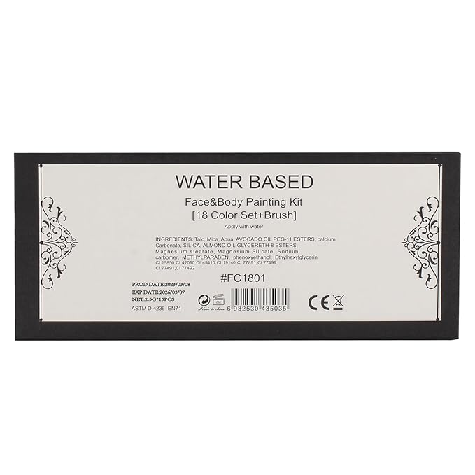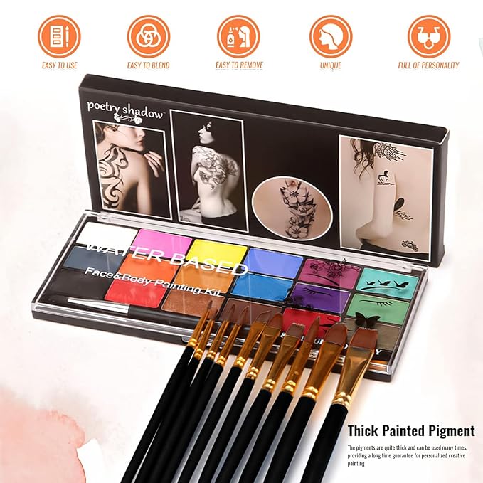 • PROFESSIONAL FACE PAINTING KIT: Our face paint is infused with 18 pressed ultra pigmented water based colors which can give you a full coverage without taking many coats. Morover, it is also packed with 10 different shape paint brushes, meeting your various requirments of facepaint creation