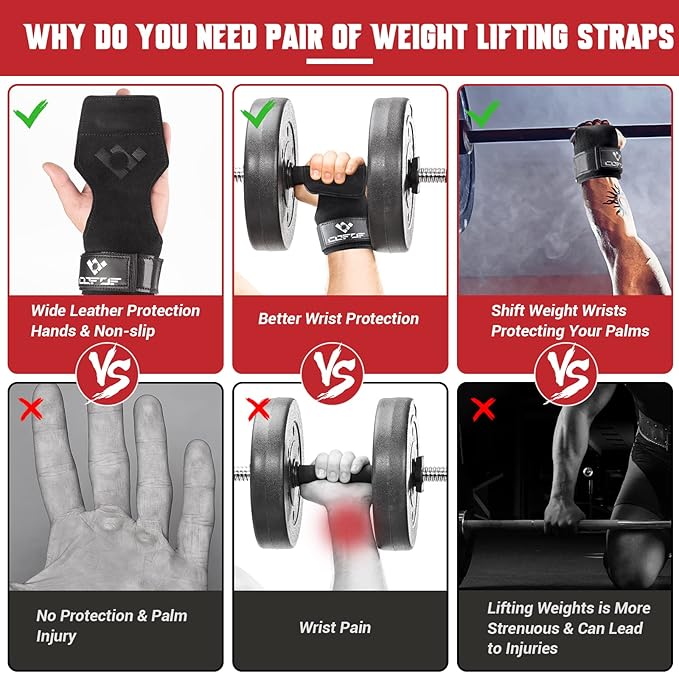 • Enhanced Grip: Professional leather deadlift straps can protect your hands from not only preventing calluses, but also peeling off existing calluses on your hands. Lifting straps take the pressure off your wrists and hands and help you lift heavier weights. More importantly, it improves your ability to exercise larger muscle groups.