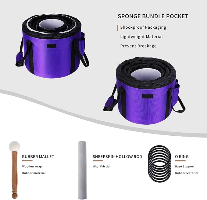 • Package includes: crystal singing bowl set (1* 6” wide Violet 432hz B Note, 1* 7” wide Indigo 432hz A Note, 1* 8” wide Blue 432hz G Note,1* 9” wide Green 432hz F Note, 1* 10” wide Yellow 432hz E Note, 1* 11” wide Orange 432hz D Note, 1* 12” wide Red 432hz C Note), 1* thick cowhide suede striker, 1* rubber mallet, 7* one O-ring, 2* carrying bags