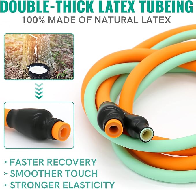 • THE LATEST UPGRADED 150LBS RESISTANCE BANDS: Our resistance bands for working out are made of 100% healthy and environmentally friendly natural latex material, which have smoother touch, stronger resistance and better wear resistance! The exercise bands resistance have 5 different strength levels, corresponding to 5 different colors (cyan 10 lbs, blue 20 lbs, red 30 lbs, orange 40 lbs, purple 50 lbs), which can be used alone or stacked in any combination to a maximum equivalent of 150 lbs