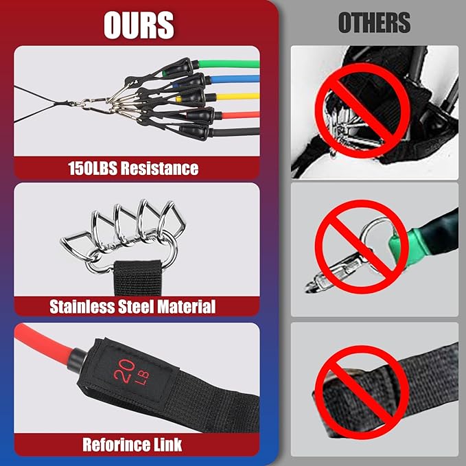 • [Adjustable Resistance Bands]--WIKDAY professional resistance bands set with handles includes 5pcs resistance bands: Yellow (10 lbs), Red (20 lbs), Blue (30 lbs), Green (40 lbs), Black(50 lbs), all 47 inches long. They can be used individually or stacked for a total resistance range from 10 lbs to 150 lbs, making them versatile strength training equipment suitable for beginners, fitness enthusiasts, athletes, and others seeking effective exercise gear