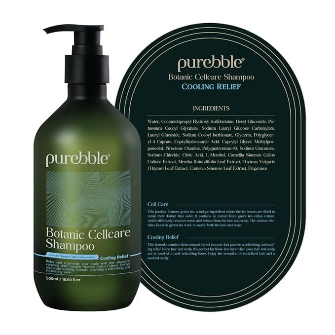 • [COOLING SCALP RELIEF] Alleviate your scalp with Purebble's Cooling Relief Shampoo. Led by Piroctone Olamine to minimizes scalp flakiness and the calming properties of green tea extract, apple mint, and thyme, feel a refreshing sensation while cleansing and nourishing your scalp.