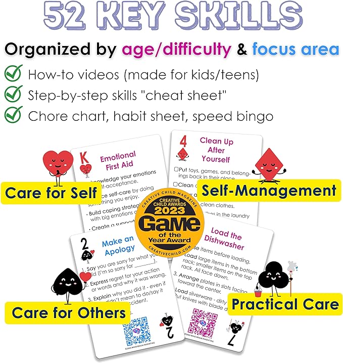 • NO MORE EXCUSES, IMMEDIATELY ACTIONABLE: learn and apply 52 essential life skills with simple how-to instructions and kid-friendly videos. Activities on cards are organized by ages, difficulty levels & responsibility categories