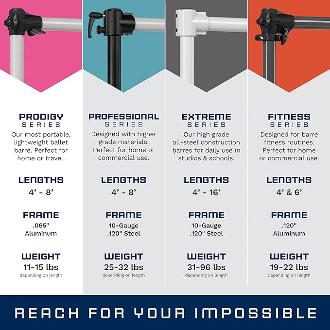 • Our premium-quality products are crafted to meet the highest standards in the industry, with durable materials like aluminum and real wood. Our Barres are stable and built to last with a powder-coated finish, solid wood barres, and sure grip rubber feet to withstand years of future workouts and ballet practice.