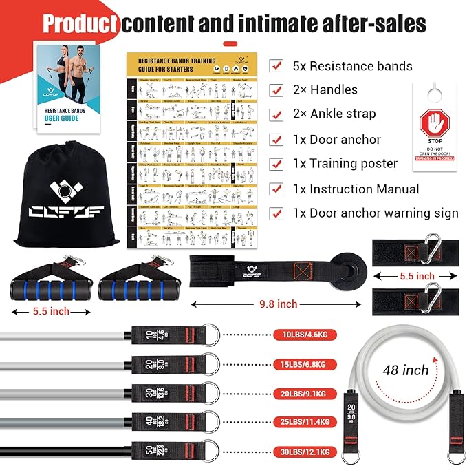 • 💞Upgraded Resistance Bands & After-sales Service: You will get resistance band*5, 2 handle, 2 ankle strap, 1 door anchor, 1 training poster, 1 instruction manual. To increase your workout intensity level, simply combine resistance bands with training posters to suit your workout needs. With resistance band exercises, you can get the perfect shape. If you encounter any problem while using the product, please contact us and we will help you to solve it within 12 hours.