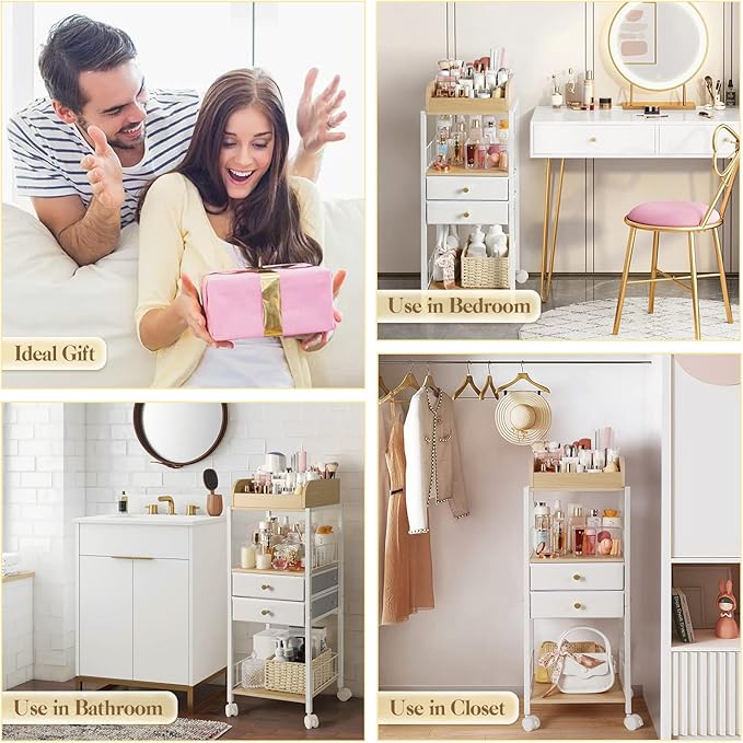 • 【Newest Floor Makeup Organizer】This makeup organizer with open spaces and storage drawers is designed to keep the skin care products, cosmetics, makeup accessories, hair tools, bags organized. It can be fixed beside bathroom vanity and bedroom dresser. The sleek and modern finish is an easy fit for home organization.