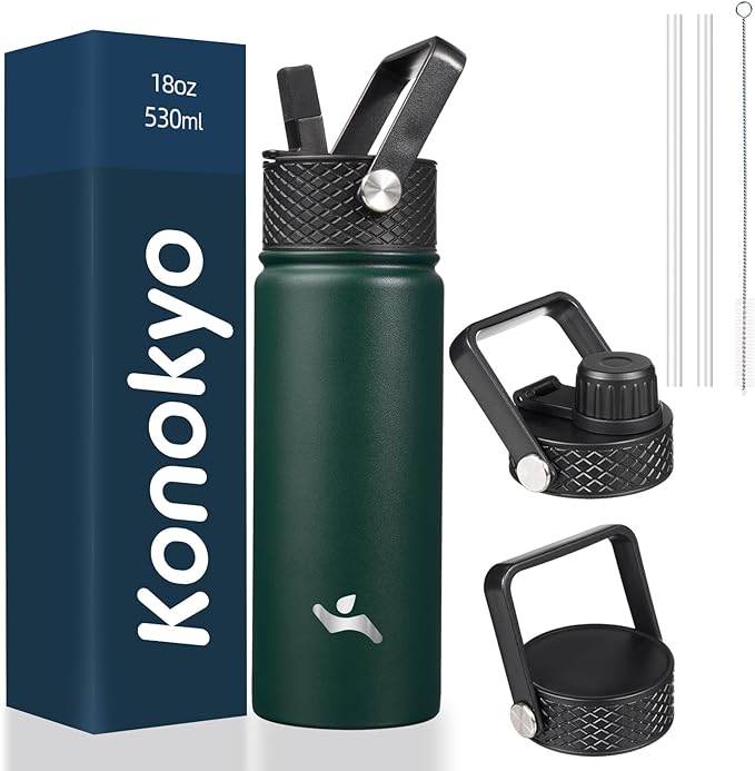18 oz Insulated Water Bottle Stainless Steel Sport Bottles with 3 Lids,Army Green
