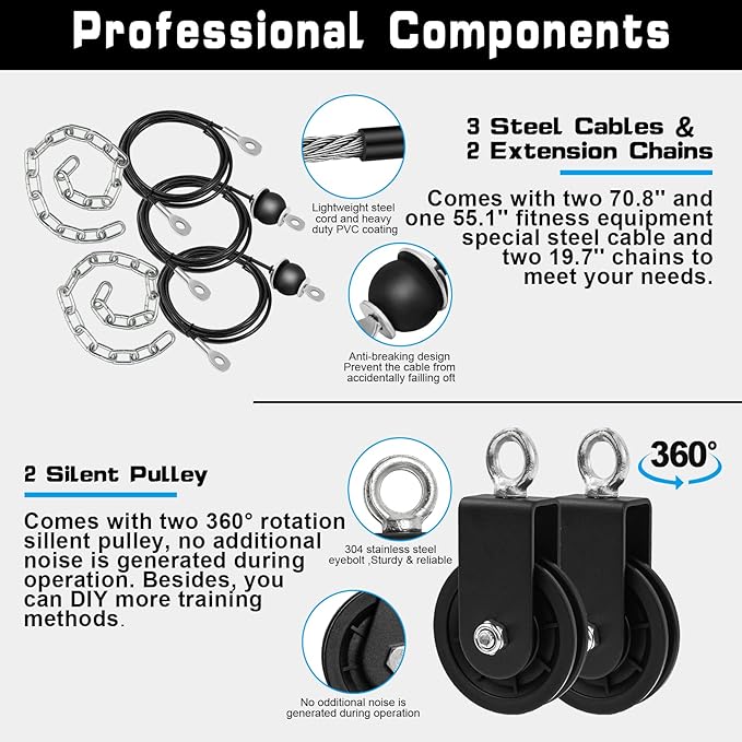 • 【Upgraded Value Kit & More Exercises Choice】 The SERTT Lat Pulley System kit has 2 pulleys and more cable machine accessories than others gym pulley system sets, allowing you to flexible DIY and choose your own way to do various exercises, such as Biceps Curl, Triceps Pull Down, Lat Pull Down, Row, Fly and etc.