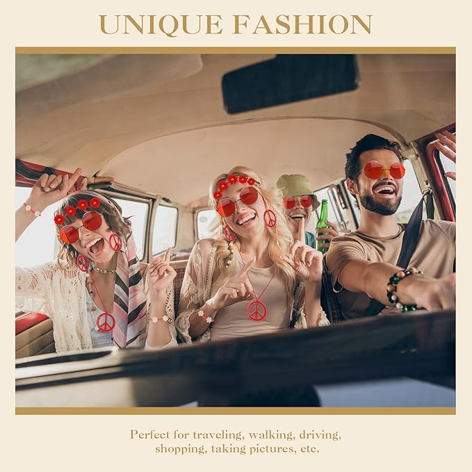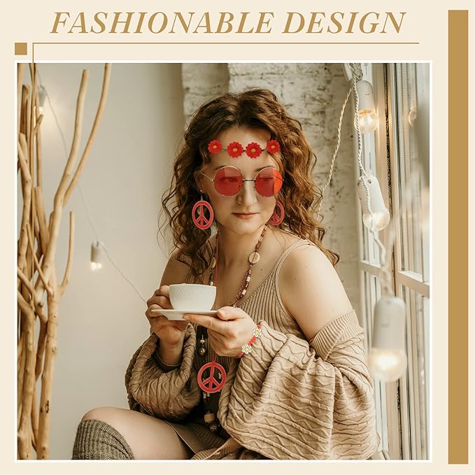 • Cool and Hip: these hippie clothes accessories are retro and trendy, boho floral hair wreath makes you look nice and charming, retro hippie glasses make you look more eye catching, peace sign necklace and earring make your charming. As this is a fashion accessory, it is recommended that you do not wear it continuously for extended periods of time. This will significantly improve comfort and avoid discomfort