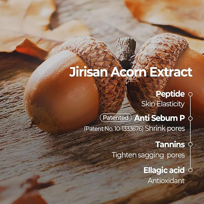 • 🌰 Jirisan Acorn Extracts : Clean Jirisan acorns rich in ellagic acid and tannins that help with pore and elasticity care. Enriched with peptides to boost elasticity and firmness and tannins to shrink pores, these pads refine and balance your skin effectively. Ellagic acid, a potent antioxidant, helps improve skin texture and protects against environmental damage. These ingredients work to minimize pores, smooth uneven skin, and promote a firmer, more radiant complexion, making them ideal for anyone seeking effective intensive pore care and skin texture improvement.