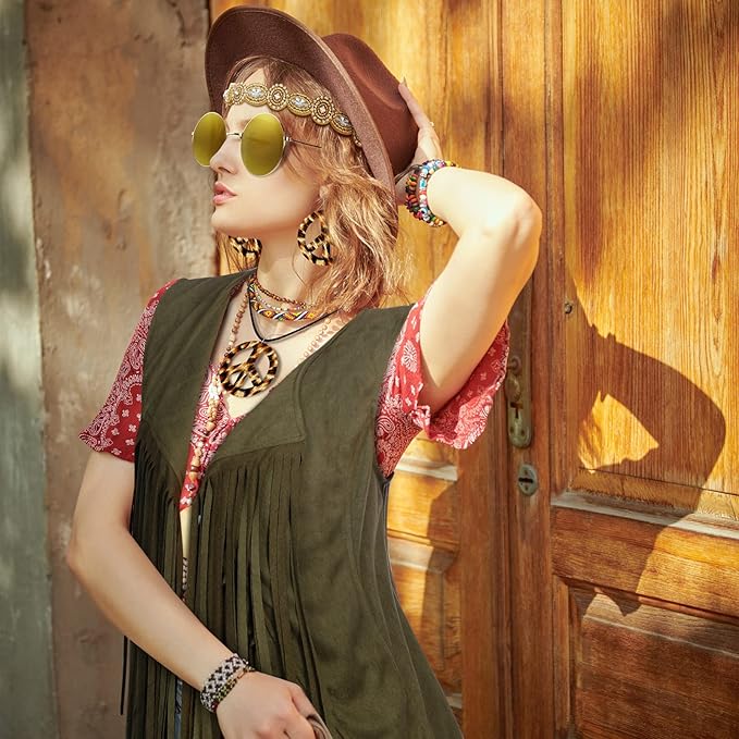 • Hippie costume set: the package includes 1 piece sleeveless vest cardigan, 1 pair of leopard print peace sign earrings, 1 piece leopard print peace sign necklace, 1 piece boho crystal like headband and 1 pair of retro sunglasses, cute hippie accessories will bring you attractive charm, show the hippie spirit of 60s and 70s, make you the focus in the theme party; Notice: After receiving the package, gently flap it with your hand, then leave it for some time to make it recover automatically