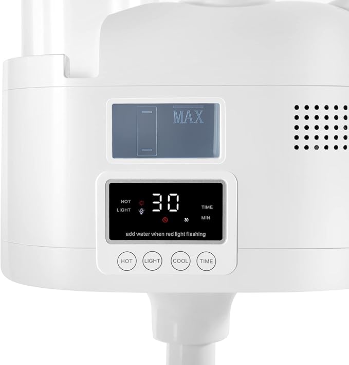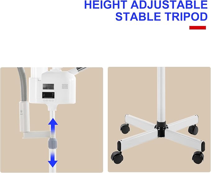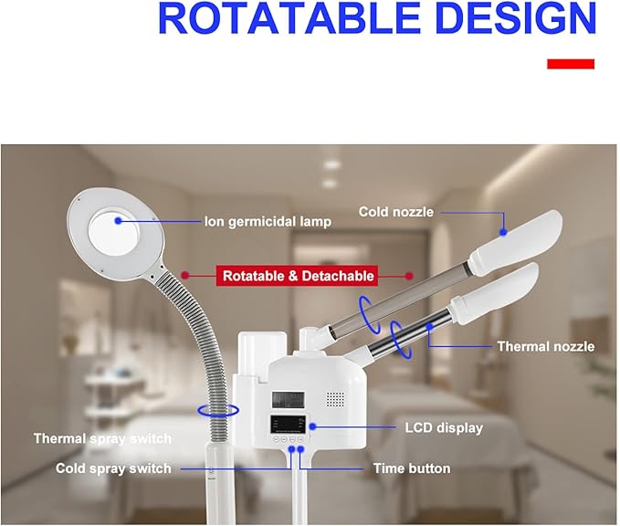• 【Convenient Design】: Adjustable height and rotating nozzle to any angle you need, the nozzle of the steamer esthetician can be rotated 360 degrees, there is a diffuser in the mouth of the nozzle, you can put the diffuser in it to use it, 4 low-noise wheels can be moved freely to any place, there is an LCD display, easy to control. Also has 10 minutes, 20 minutes, and 30 minutes of timing according to their own time freely adjustable.