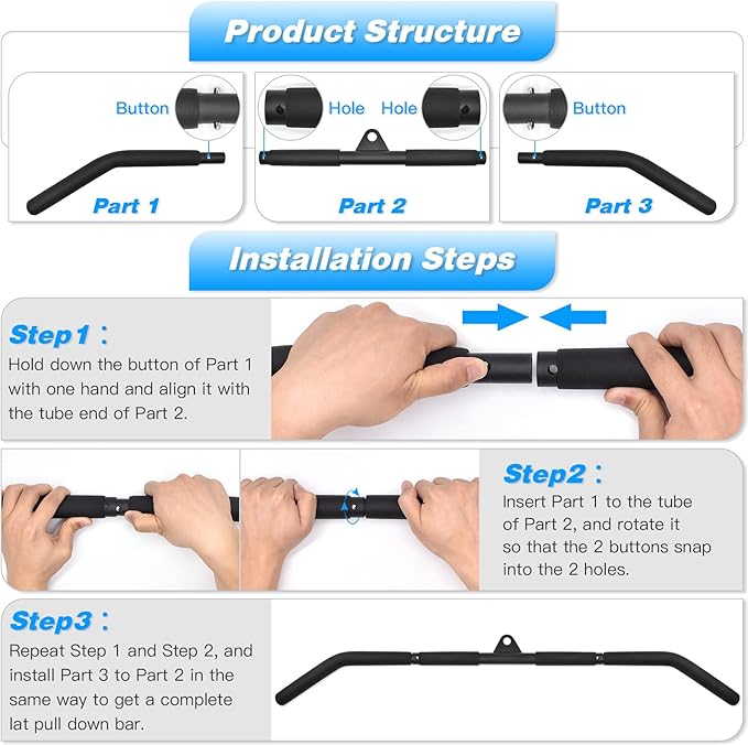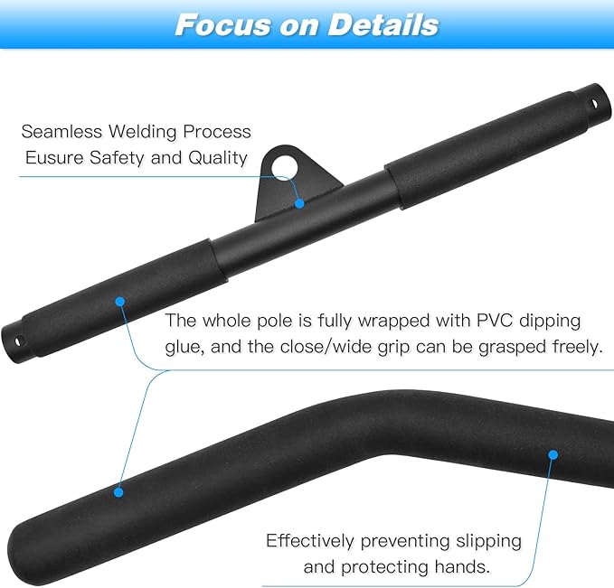 • 💪【Professional Gym Bar】 It has 3 parts with 2 modes: long bar (39.37 inches) and short bar (15.7 inches). Long bar: completing actions such as lat pull down, can exercise your back and shoulder muscles. Short bar: Suitable for lifting, rowing, Strengthen your biceps, triceps, and abdominal muscles.
