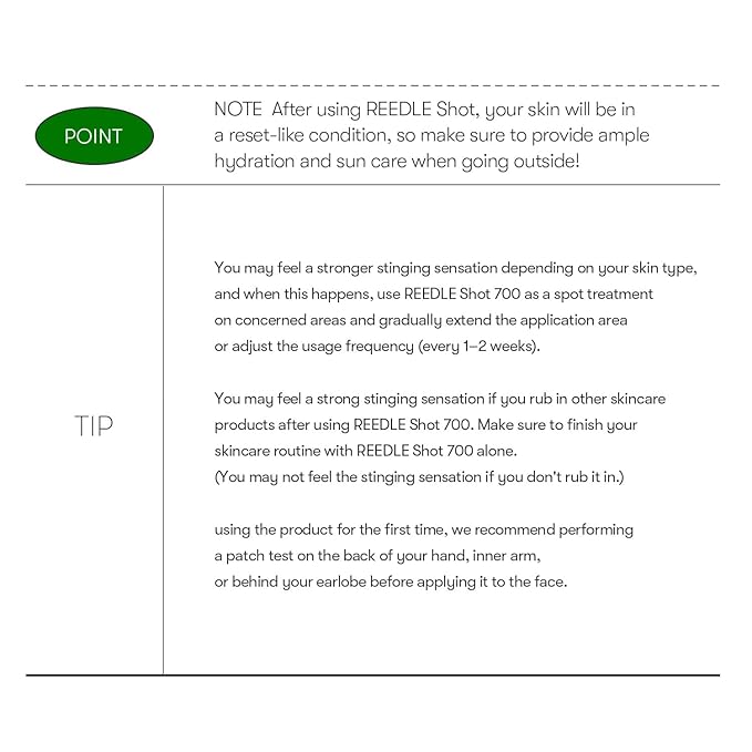 • * While using our Reedle Shot essence, you may feel a slight tingling sensation, which is completely normal and indicates skin improvement. Rest assured, it contains 'cica reedle' for soothing benefits. To minimize the tingling, try applying toner after cleansing, then gently tapping on the essence.