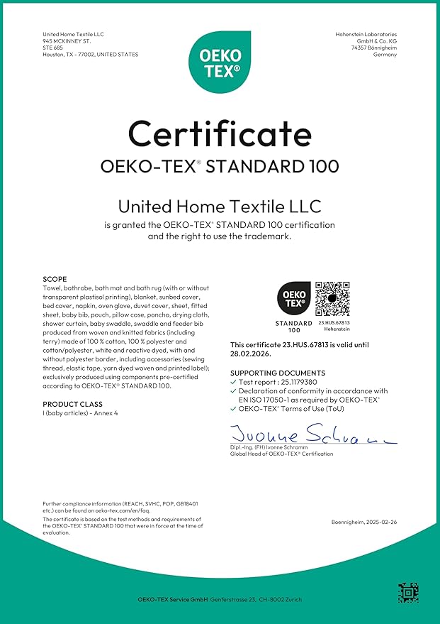 • ✔ OEKO-TEX STANDARD 100 keeps you and your family safe by testing [each component of] a certified product against a list of over 1,000 harmful substances. Certificate #23.HUS.67813 by Hohenstein.