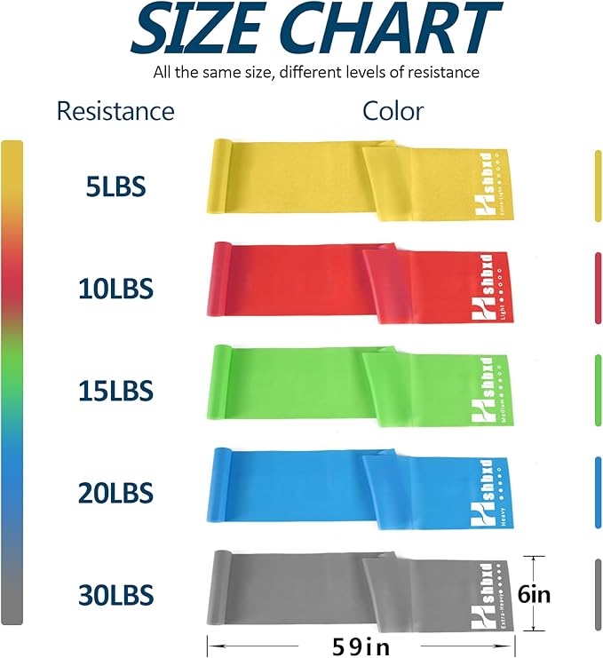 • 5 Levels Of Resistance - 5 resistance bands are 59in (150cm) long and 5.9in (15cm) wide, the resistance bands is yellow band (5 lbs), red band (10 lbs), green band (15 lbs), blue strap (20 lbs), gray strap (30 lbs).